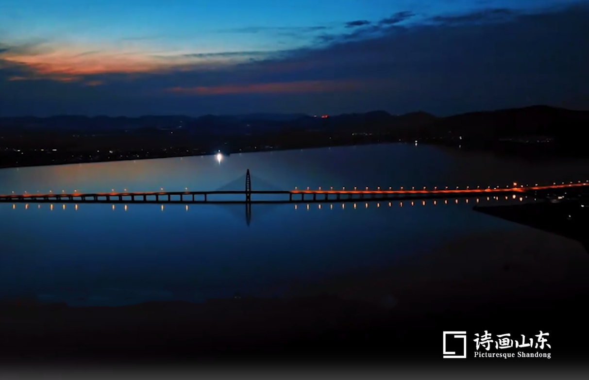 近日,航拍夜幕下的枣庄东江特大桥,犹如一条横卧着的长龙,闪耀着璀璨的光芒。(来源:闪电新闻)