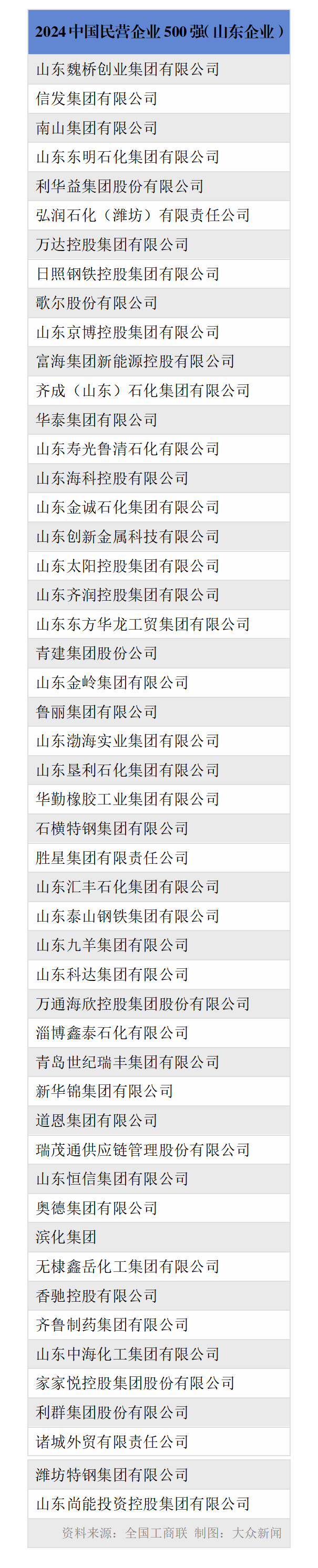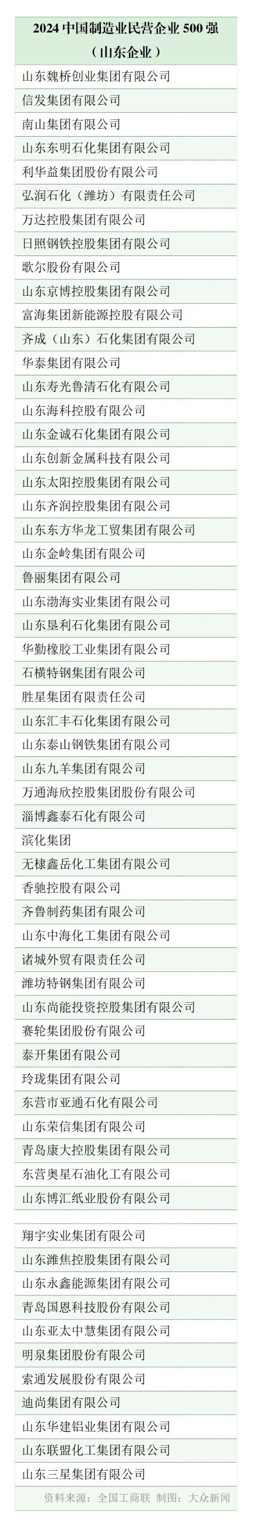 山东共有魏桥创业集团等50家企业入选“2024中国民营企业500强”,59家企业入选“2024中国制造业民营企业500强”,青岛世纪瑞丰集团有限公司等5家企业入选“2024中国服务业民营企业100强”。具体名单如下: