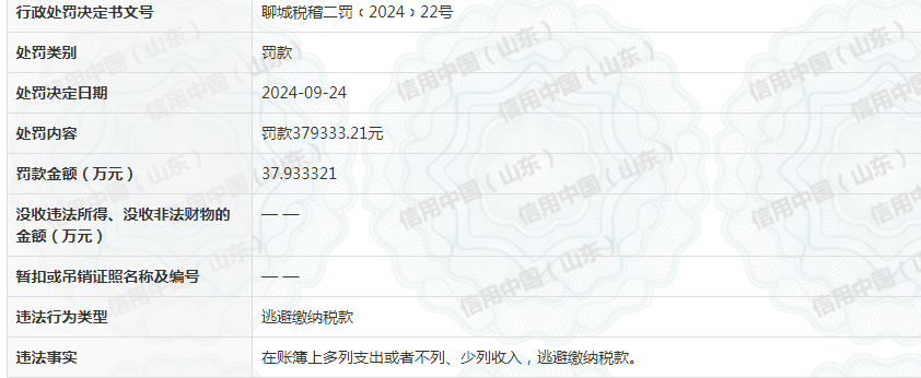 更为严重的是,在此前的9月24日,国家税务总局聊城市税务局第二稽查局对其作出罚款379333.21元的处罚决定,概因其逃避缴纳税款。