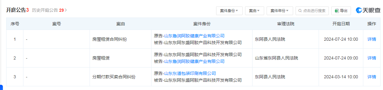 天眼查等平台显示,今年以来,东盛阿胶还牵涉多起分期付款买卖合同纠纷、房屋租赁合同纠纷等案件。其中,与山东鲁润阿胶健康产业有限公司的互诉案件引人关注。