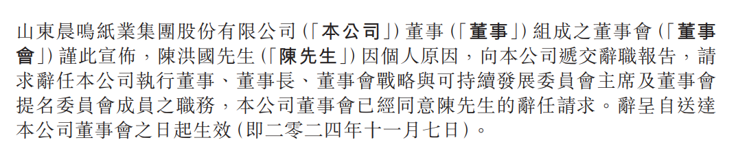 与此同时,晨鸣纸业在公司治理层面也出现了重大变动。晨鸣纸业于11月8日公告中称,原董事长陈洪国因个人原因申请辞去公司董事、董事长以及董事会下设战略与可持续发展委员会委员、提名委员会委员等职务,其妻子李雪芹因到龄退休,申请辞去副总经理职务,辞职后,将不在公司任职。