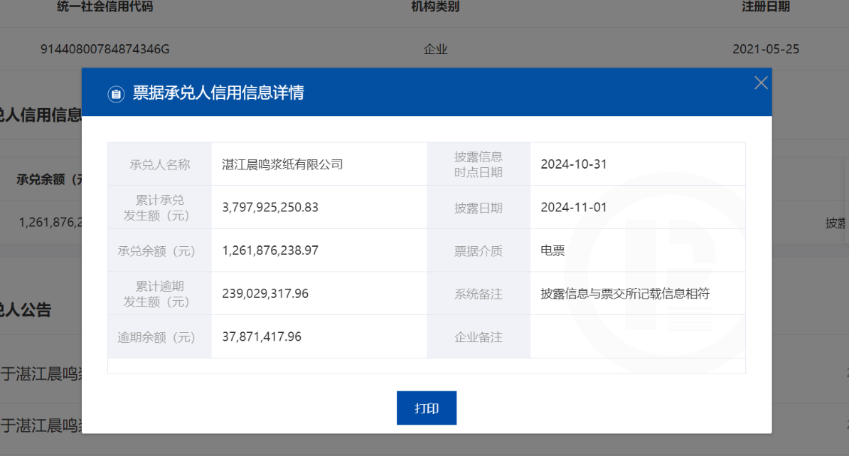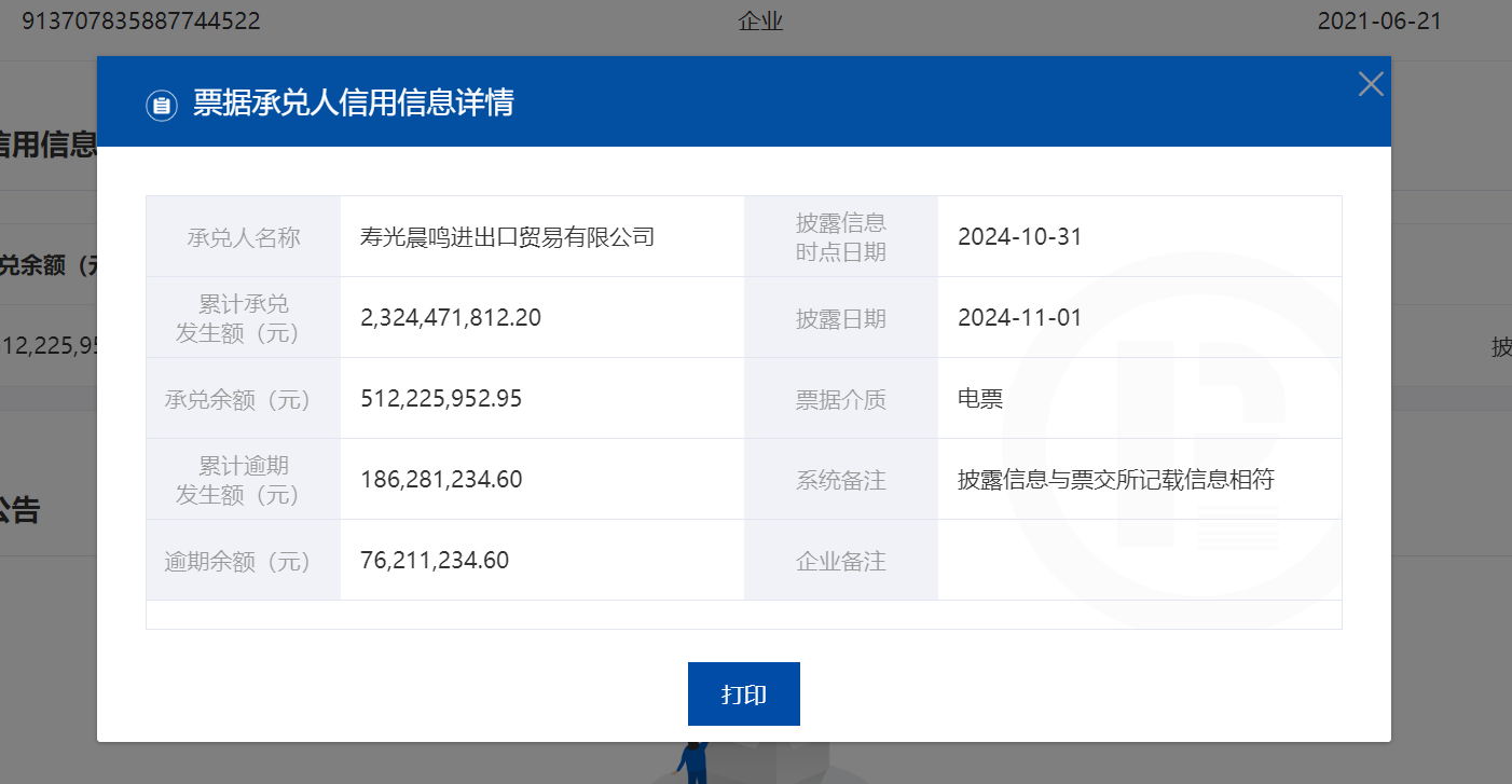 消息显示,2024年5月1日至2024年10月31日,发生3次以上票据逾期,且月末有逾期余额或当月有票据逾期行为发生的承兑人数量为1617家,其中,山东晨鸣纸业集团股份有限公司(下简称“晨鸣纸业”)在列,累计逾期发生额363020274.77元,逾期余额236020274.77元。