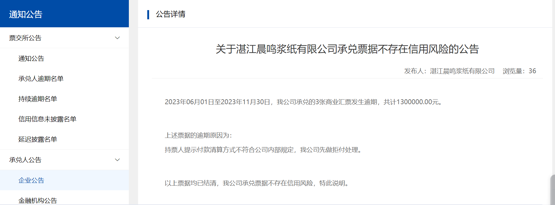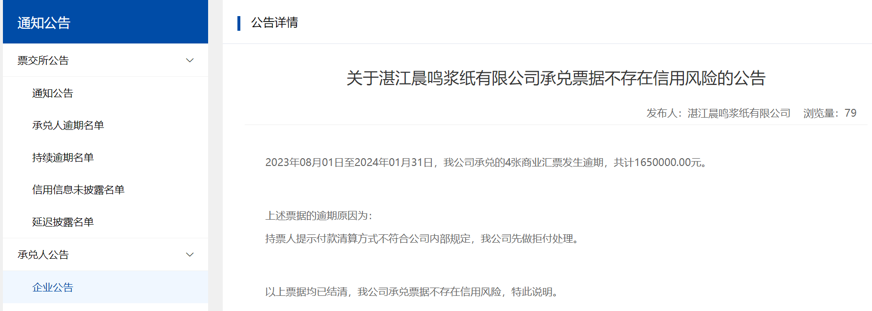 值得注意的是,湛江晨鸣浆纸有限公司有过多次票据逾期情况。此前,湛江晨鸣浆纸有限公司分别在2023年12月4日和2024年2月1日对公司逾期情况在上海票据交易所网站发布过承兑人公告。两次公告都声明出现票据逾期是由于持票人提示付款清算方式不符合公司内部规定,公司做了拒付处理。