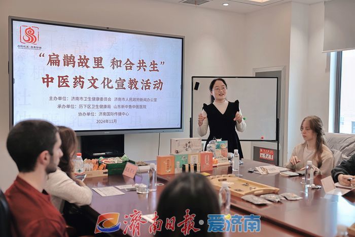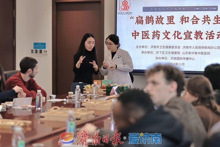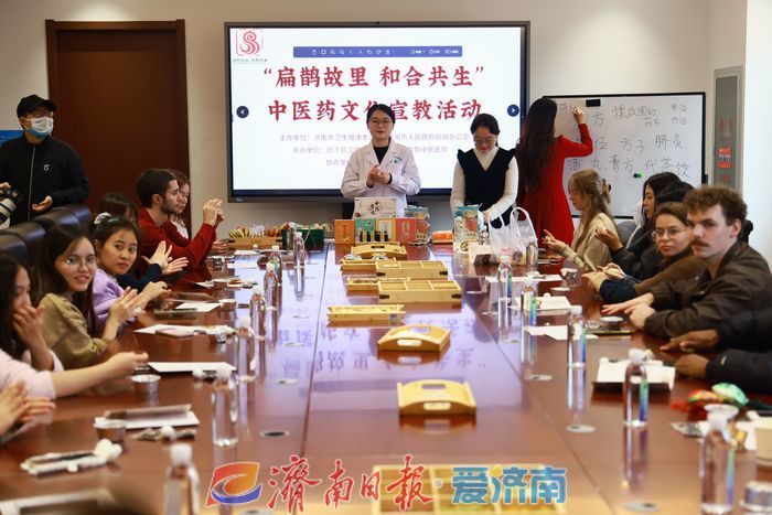 弘扬扁鹊文化,向世界讲好中医药故事。为普及中医药知识、传承和弘扬中医药文化,让更多人了解中医药的魅力与价值, 11月15日,由济南市卫生健康委员会、济南市人民政府新闻办公室联合主办,历下区卫生健康局、山东新中鲁中医医院(趵突泉院区)承办,济南国际传播中心协办的“扁鹊故里 和合共生”中医药文化科普宣教活动在山东新中鲁中医医院(趵突泉院区)举办,来自山东师范大学国际教育学院的老师及学生共21人共同参与。此次活动旨在利用济南市中医药文化资源富集优势,面向国际学生群体开展中医药文化传播工作,多渠道、全方位展示中医药文化的独特魅力,持续提升“扁鹊故里”中医药品牌的影响力。