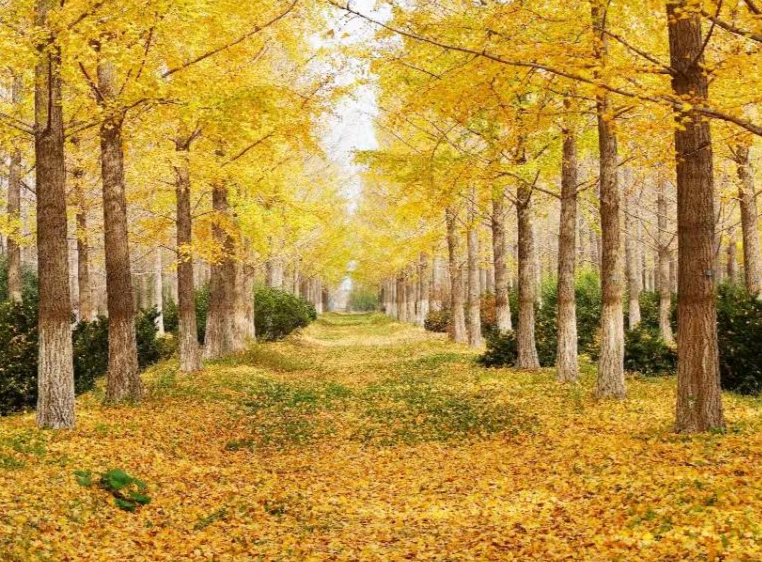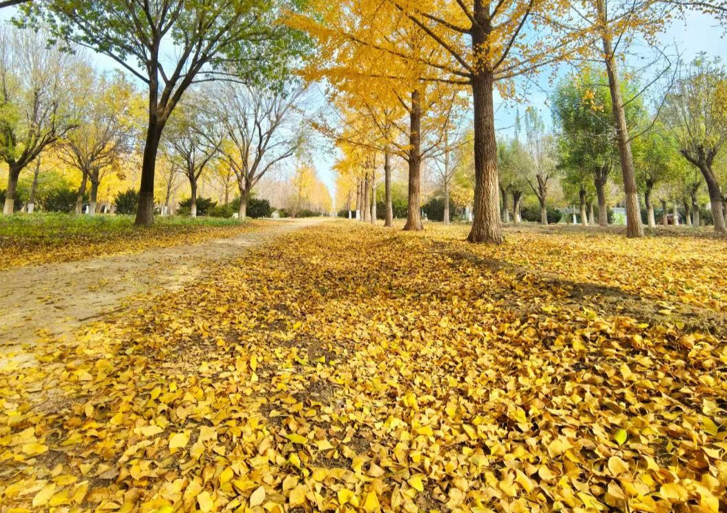 在临沂,片片银杏叶随风缓缓飘落,它们轻盈地把大地铺就成一片金灿灿的海洋。