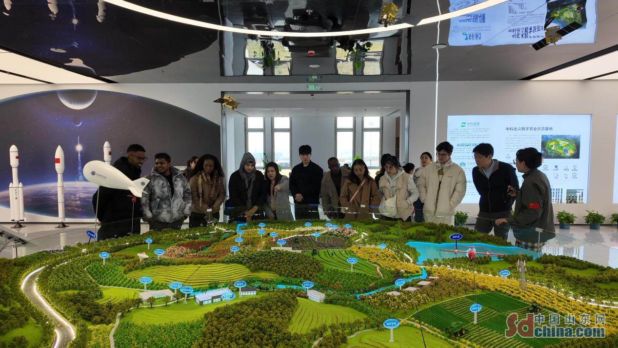 随后,国际友人们前往中科北斗数字农业示范基地。在这里,他们了解了数字农业的最新技术和应用,包括空天地网一体化农业应用平台、地理标志农产品数字农业示范基地、复杂地形无人机械研发基地等。