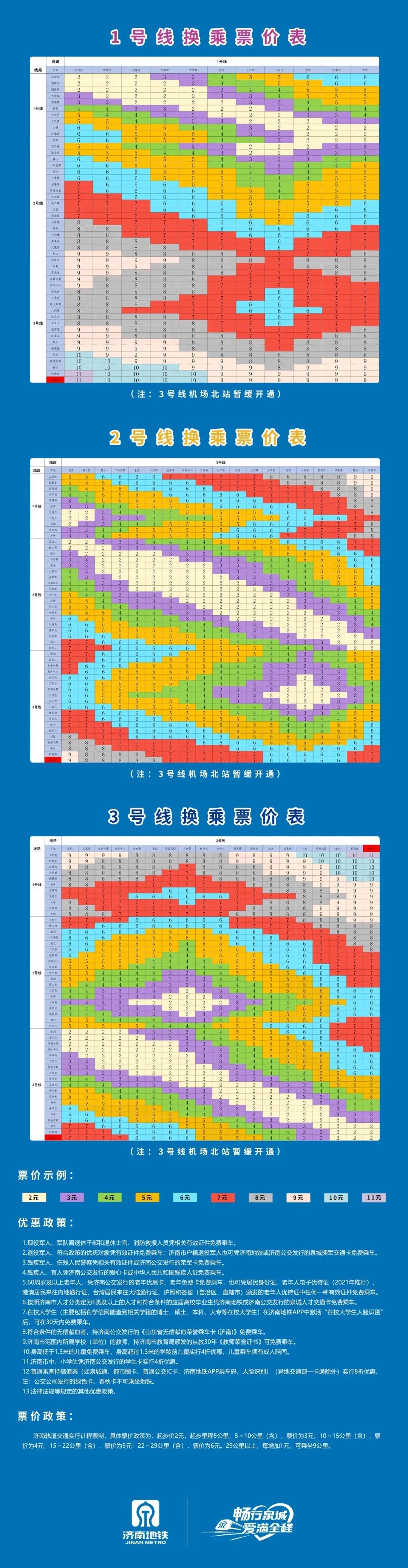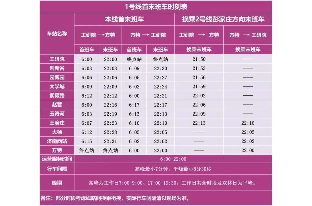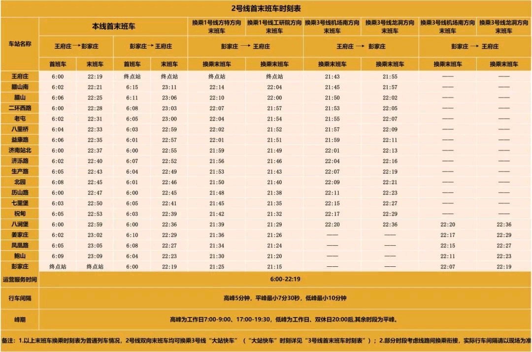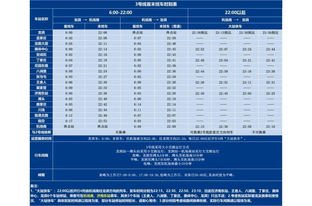 3号线二期初期运营后,济南地铁线网运营服务时间将同步优化调整,1号线为6:00~22:00,2号线为6:00~22:19,3号线首班车时间为6:00,往机场南站方向的末班车时间为22:06,往龙洞站方向的末班车时间为23:10,每日22:00以后开行4列“大站快车”。结合当前机场航班的实际,济南地铁可运送乘客基本能够覆盖机场约90%以上的航班。