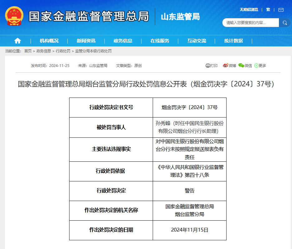 时任中国民生银行股份有限公司烟台分行行长助理的孙秀峰,对中国民生银行股份有限公司烟台分行未按照规定报送报表负有责任,国家金融监督管理总局烟台监管分局依据《中华人民共和国银行业监督管理法》第四十八条,对孙秀峰给予警告处罚。处罚决定日期为2024年11月15日。