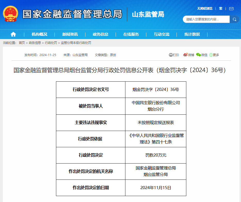 凤凰网山东(报料微博@凤凰网山东)日前获悉,11月25日,国家金融监督管理总局烟台监管分局发布行政处罚决定书(烟金罚决字〔2024〕36号),中国民生银行股份有限公司烟台分行未按照规定报送报表。国家金融监督管理总局烟台监管分局依据《中华人民共和国银行业监督管理法》第四十七条规定,对中国民生银行股份有限公司烟台分行罚款20万元。处罚决定日期为2024年11月15日。