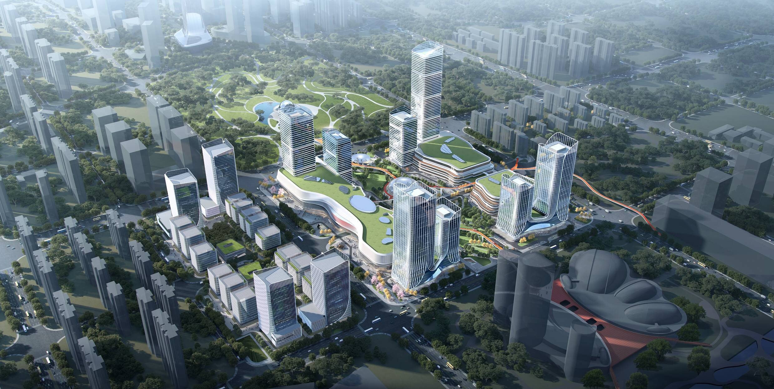 在万达广场项目不远处,龙湖天街施工现场同样人声鼎沸、机械轰鸣。该项目规划总建筑面积22万平方米,定位“转念即达的欢乐入口”,汇聚了一站式吃、喝、玩、乐、购全业态布局。作为高端商业品牌的银泰商业综合体,同样也在热火朝天建设中,建成后将与周边各大商圈联动,为广大消费者提供一处超大型“吃住行游购娱”全新场地,全面提升消费体验,引领城市商业新标杆。