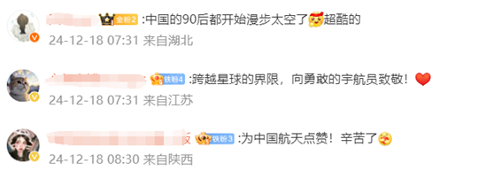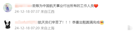 按计划,神舟十九号载人飞行任务期间,还将实施人员和应用载荷出舱活动,并开展大量科学实验与技术试验。网友纷纷留言点赞: