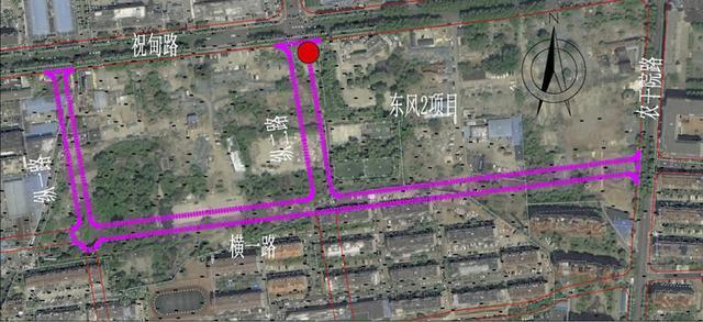 东风组团:纵一路,北起祝甸路,南至横一路,红线20米,规划为城市支路,全长194.64米;纵二路,北起祝甸路,南至横一路,红线20米,规划为城市支路,全长193.17米;横一路,西起纵一路,东至农干院路,红线15米,规划为城市支路,全长612.18米。