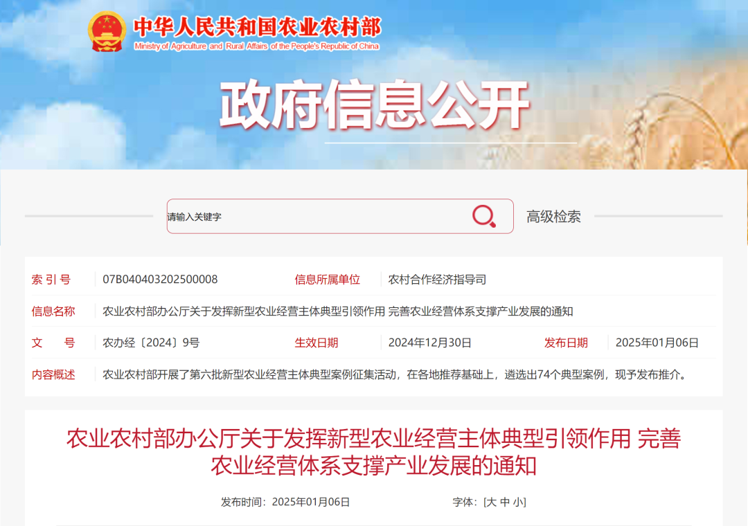 贯彻落实党中央、国务院关于完善农业经营体系、促进农民合作经营的战略部署,农业农村部开展了第六批新型农业经营主体典型案例征集活动,在各地推荐基础上,遴选出74个典型案例,现予发布推介。