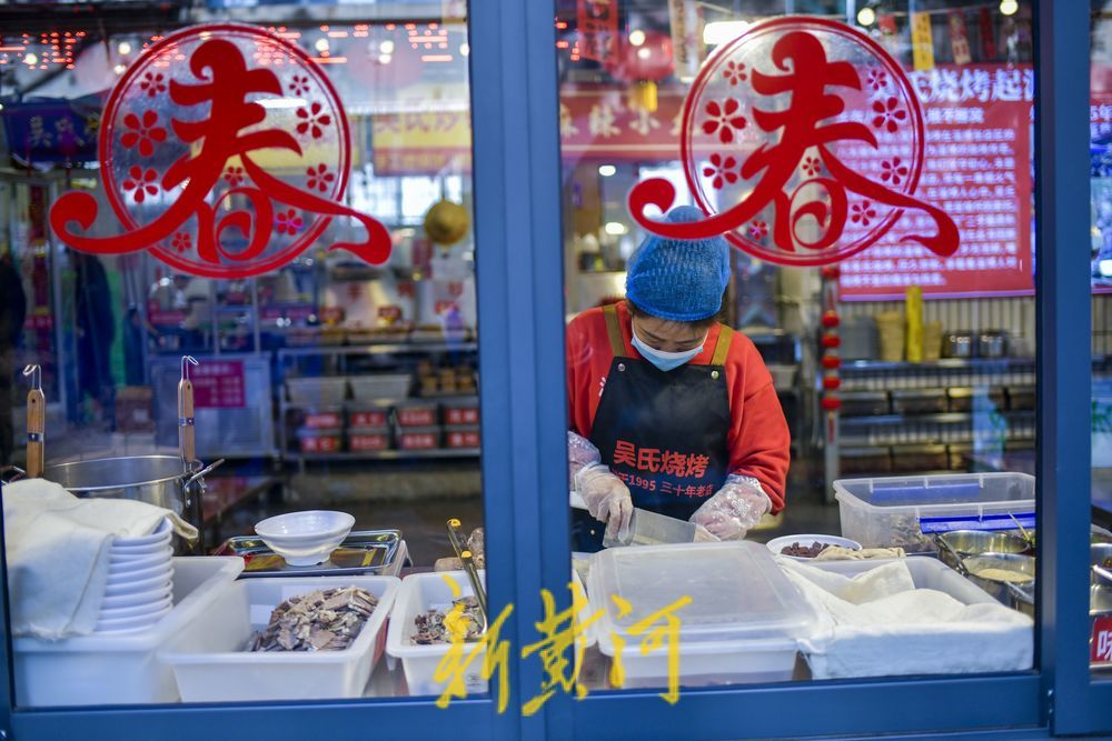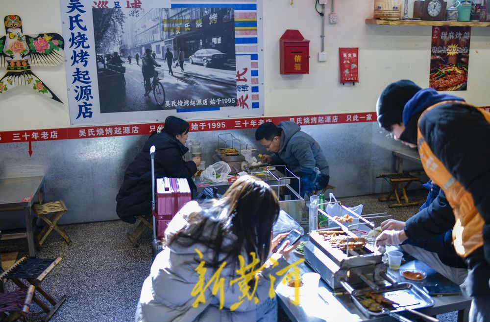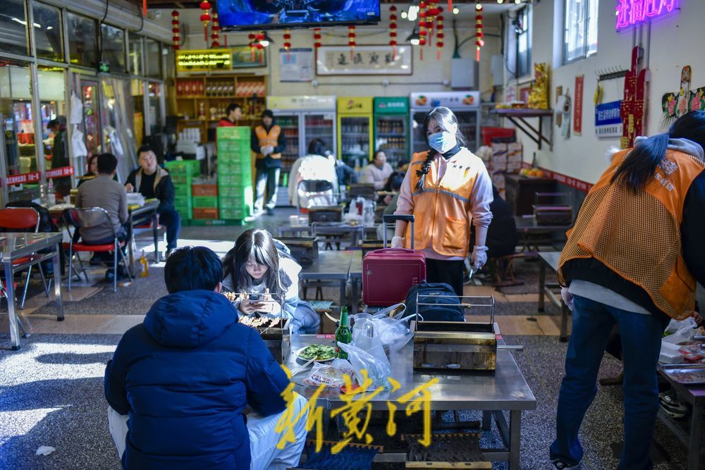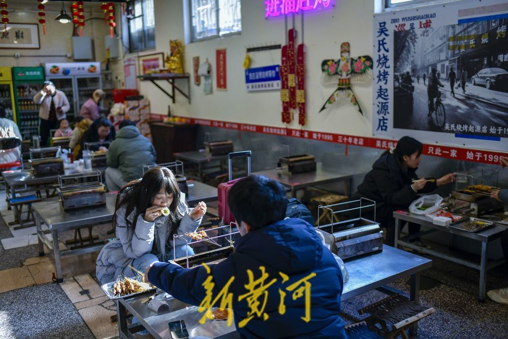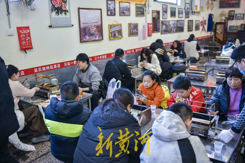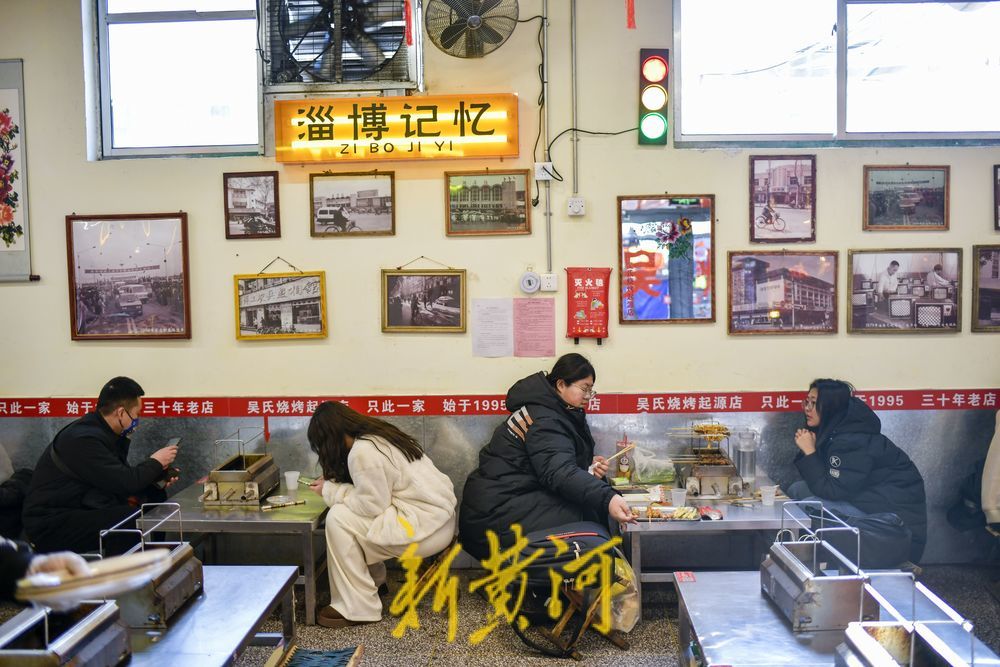 在八大局便民市场的一家网红烧烤店里,三四个食客围坐一桌,每人一个小马扎,羊肉、牛肉在桌上的小烤炉上炙烤出阵阵香味,食客手中握着卷饼、小葱、蘸酱这淄博烧烤“三件套”等待着烤串出炉。烧烤店从上午9点开门营业,一直经营到晚上11点,周末高峰时一天能接待100多桌。