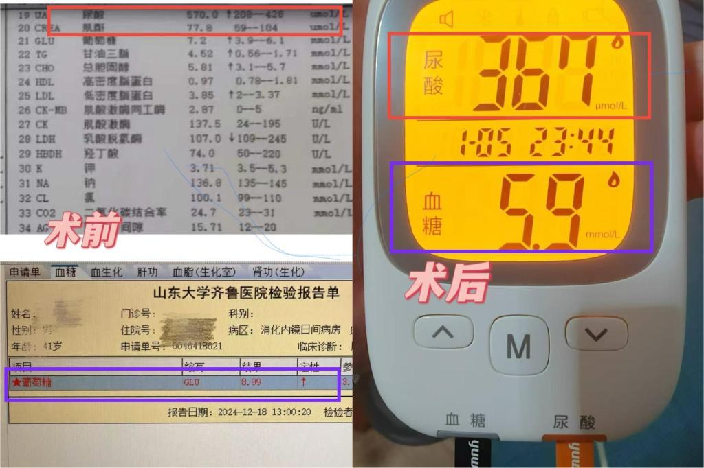 41岁的王先生是一名希望减重的患者,腹围103厘米,BMI 32kg/m2,同时还伴随高血压、高血糖、高血脂、高尿酸等一系列健康问题,一次偶然的机会得知齐鲁医院内镜中心有胃转流支架减重手术,了解到在做胃镜时就可以置入,术后一段时间还可以移除支架,王先生决定尝试治疗。经过全面评估,王先生属于中度肥胖同时合并代谢综合征,排除手术禁忌后,经无痛胃镜置入了减重支架。术后一个月,王先生体重由93kg降至85.45㎏,血糖、尿酸也降至正常。