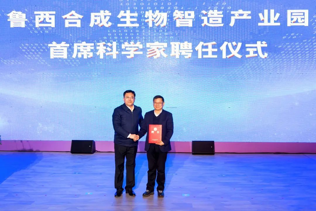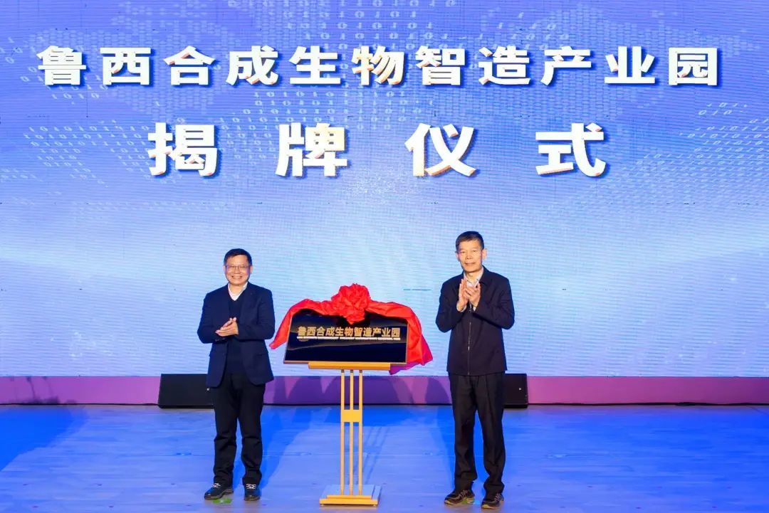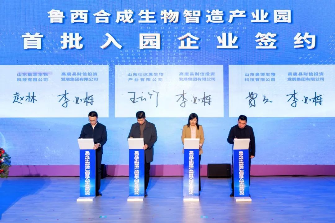 仪式上,张友明和程继峰共同为鲁西合成生物智造产业园揭牌,孙迁国向张友明颁发了“鲁西合成生物智造产业园首席科学家”聘书。山东仕达思生物产业有限公司、山东集萃生物科技有限公司、山东奥博生物科技有限公司作为首批入园企业,与高唐县财信投资发展集团进行了现场签约。