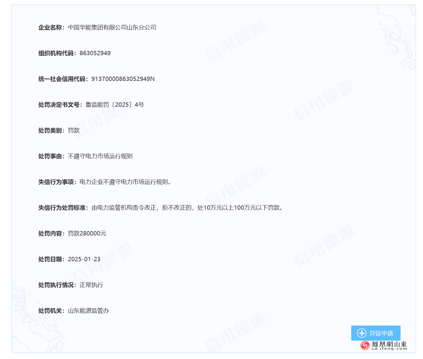 近日,信用能源官网公布处罚决定书鲁监能罚〔2025〕4号,中国华能集团有限公司山东分公司(以下简称“中国华能山东分公司”)因不遵守电力市场运行规则,被山东能源监管办罚款280000元。处罚日期为2025年1月23日。