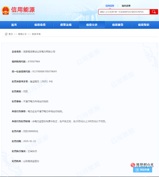 凤凰网山东(报料微博@凤凰网山东)近日从信用能源官方查询获悉,国家能源集团山东电力有限公司(以下简称:国能山东电力)因不遵守电力市场运行规则,被山东能源监管办处以280000元罚款,处罚日期为2025年1月23日。