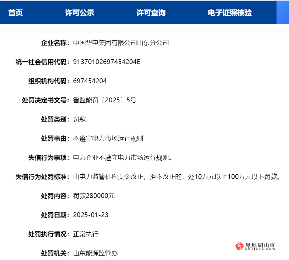 2025年1月23日,国家能源局信用能源监管平台官网公布了中国华电集团有限公司山东分公司的处罚信息,显示该公司因不遵守电力市场运行规则被山东能源监管办罚款28万元。