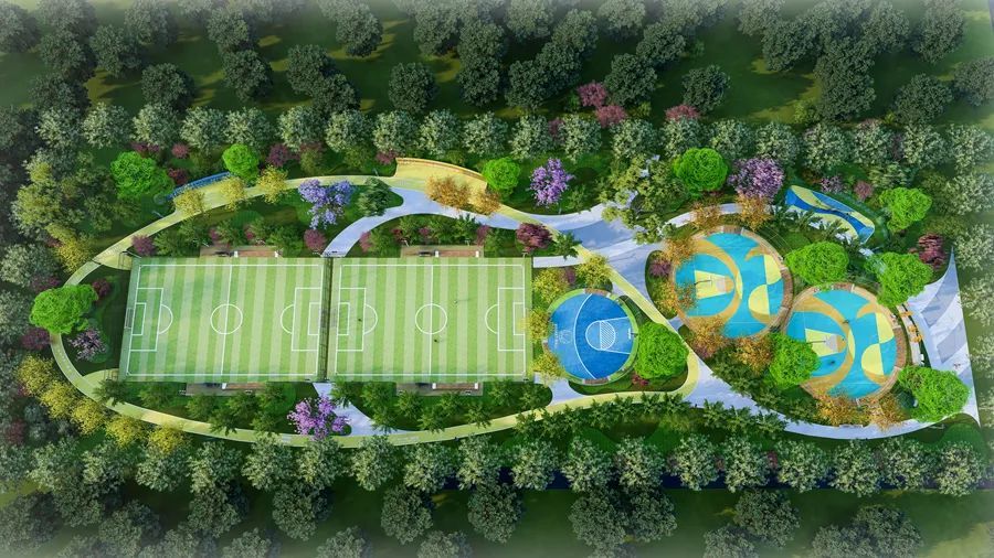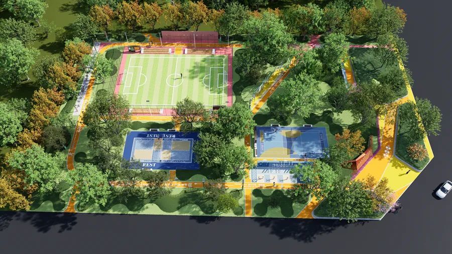 滨河儿童友好体育公园位于利民东路与二干路交叉口向东100米路北,用地面积10076平方米。该公园以儿童友好为主题,设有羽毛球场、网球场、乒乓球场、篮球场(含1个儿童篮球场)、儿童娱乐等场地,配套建设公共卫生间、景观廊架等附属设施。目前已完成绿化地形二次整理、景观廊架地形整理,正在进行剩余苗木栽植、管理用房建设等工作,整体完成进度约81%。建设东路运动公园效果图