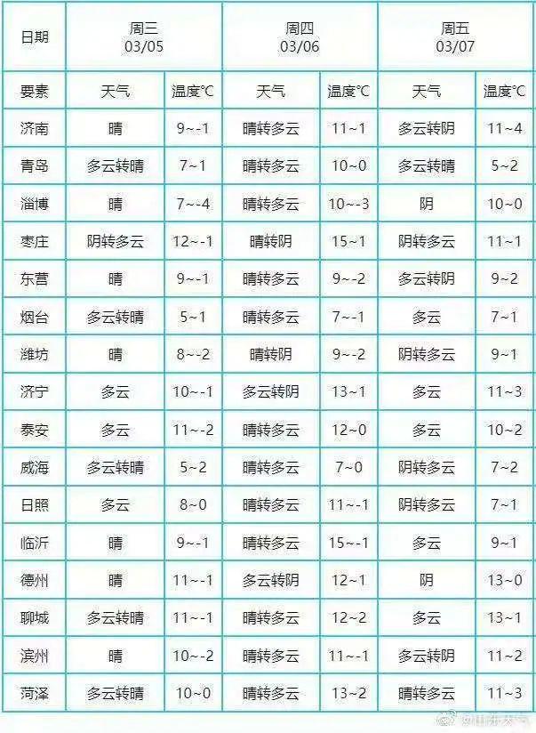 据山东省气象台今天(3月5日)8时最新预报,寒潮和雨雪天气已结束,预计我省未来三天大部地区以晴为主,气温回升,预计5—6日全省晴间多云,7日鲁西北和鲁中地区多云转阴局部有小雨。
