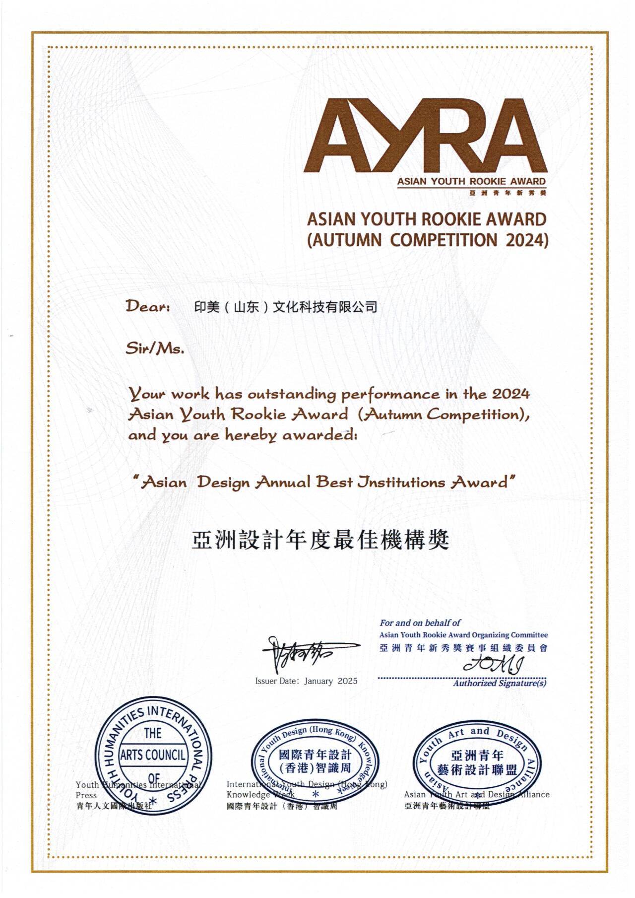 在2024山东工艺美术博览会暨“山东手造”精品展上,印美文化创作的《马超越》《黄河杯》脱颖而出,摘得“荷花杯”山东省工艺美术设计创新大赛金奖。2024年12月,印美文化为沾化古城打造的“乡村振兴文化项目”斩获金紫荆国际广告创意奖。2025年1月,印美文化荣获“亚洲设计年度最佳机构奖”。
