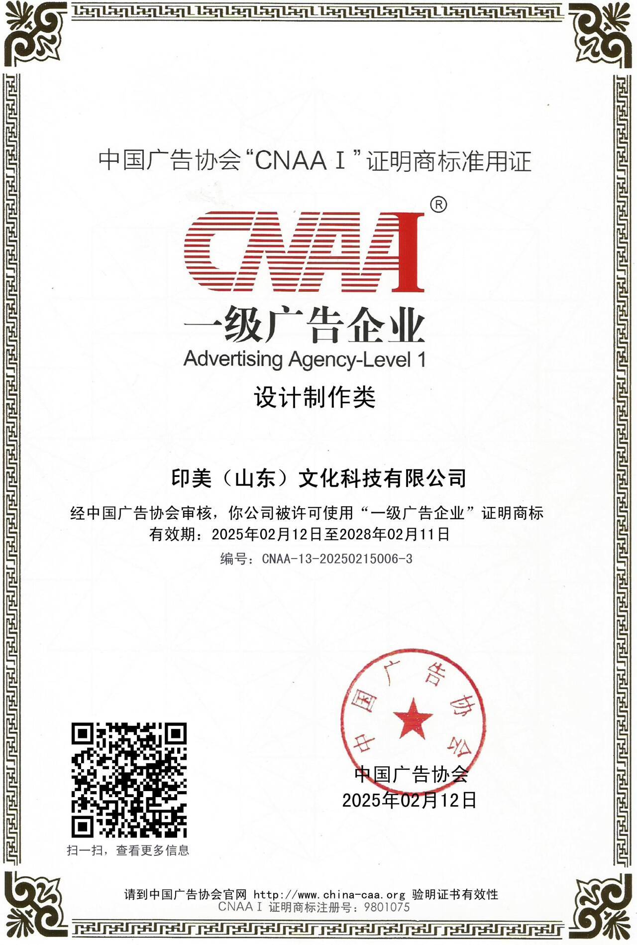 近日,槐荫专精特新企业再传佳讯,印美文化正式获得中国广告协会颁发的 CNAAI 一级广告企业资质。这一资质是中国广告行业的最高级别认证,标志着印美文化综合实力跃居全国广告行业第一梯队,也彰显了槐荫区专精特新企业在细分领域的强劲竞争力。
