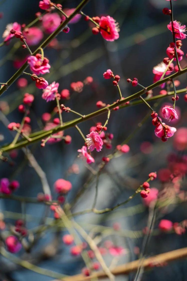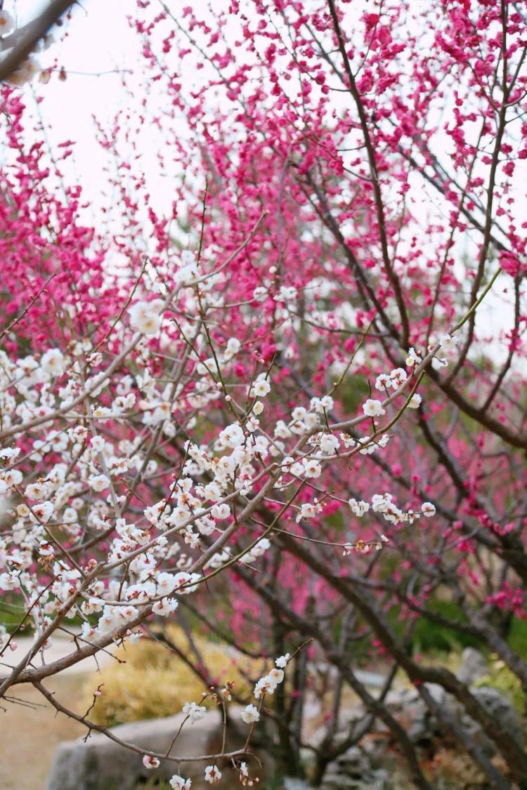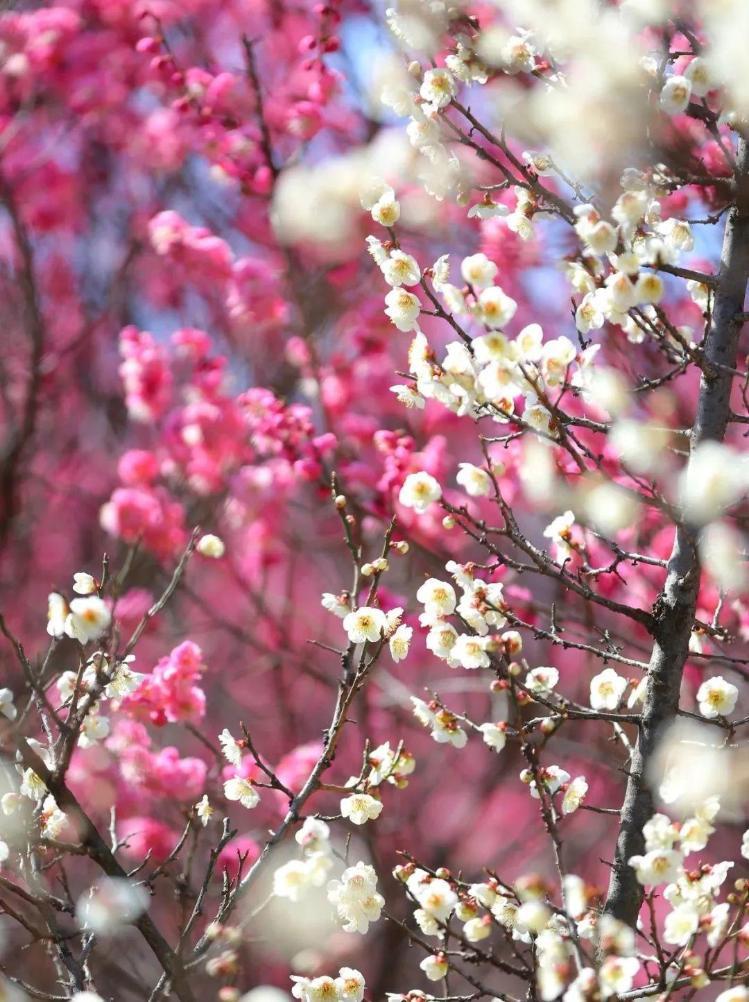 红梅如锦似霞,白梅高洁淡雅,粉梅幽香环绕……缤纷的色彩交织成一幅醉人的春景图,来往的游人穿梭于梅林间,携一缕枝头的暗香,在春风中探幽寻芳。