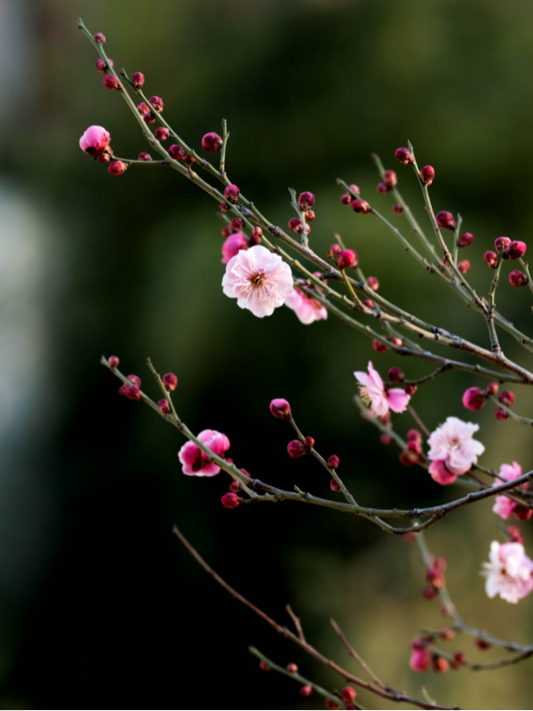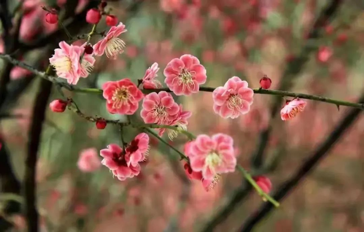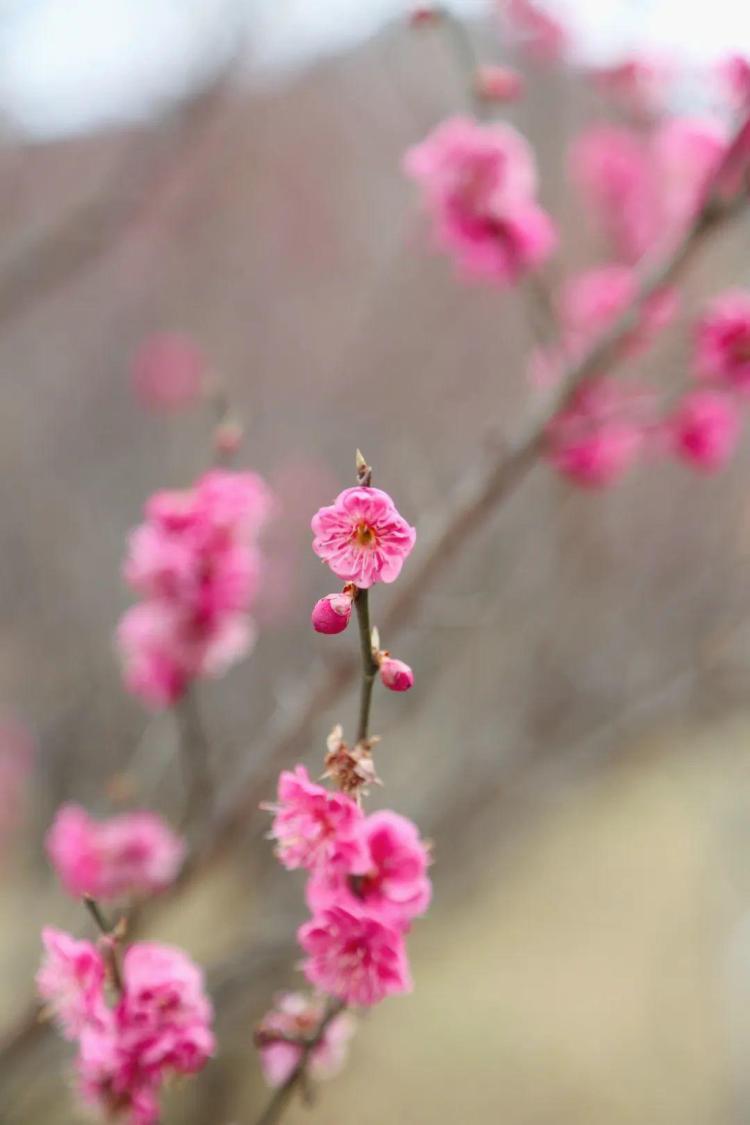 娇艳的梅花,在春风中舒展摇曳,粉如黛、白如雪,远近有致,意境万千,像一首诗,如一幅画。