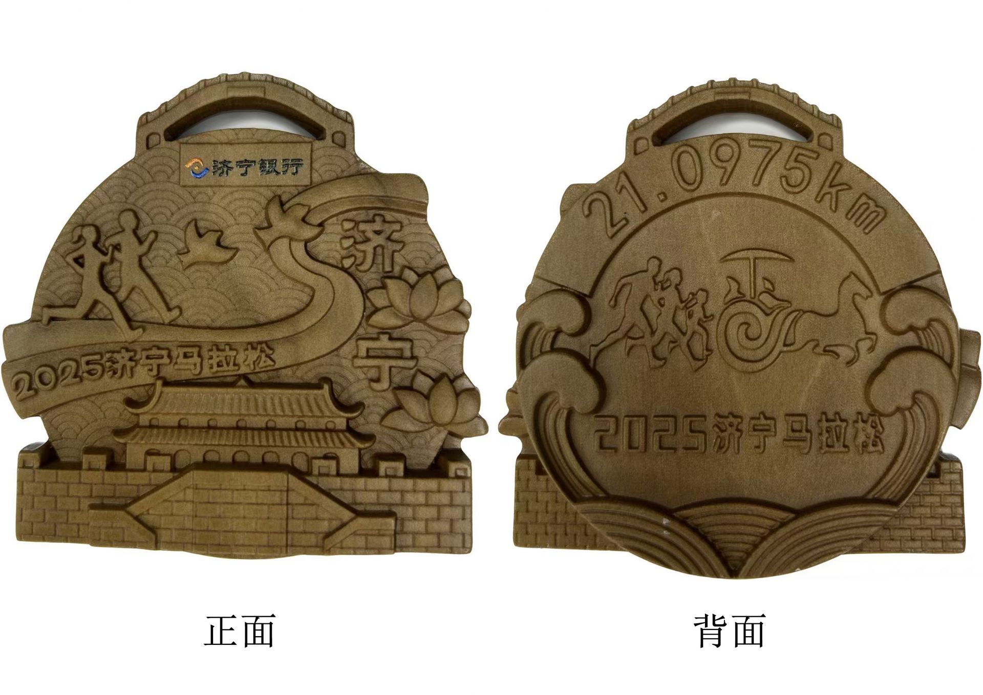 获奖选手奖牌采用紫檀木制作,象征着选手们在赛道上的非凡成就。设计理念独具匠心,正面呈现两人在赛道上奔跑的画面,象征着参赛者的拼搏与坚持。下方则是济宁的标志性建筑——太白楼,彰显了城市的历史文化底蕴。奖牌的反面正中央镶嵌着赛事logo。吊环设计采用拱桥造型,象征着连接与沟通,寓意着马拉松赛事不仅是体育竞技的盛宴,更是文化交流的桥梁与纽带。