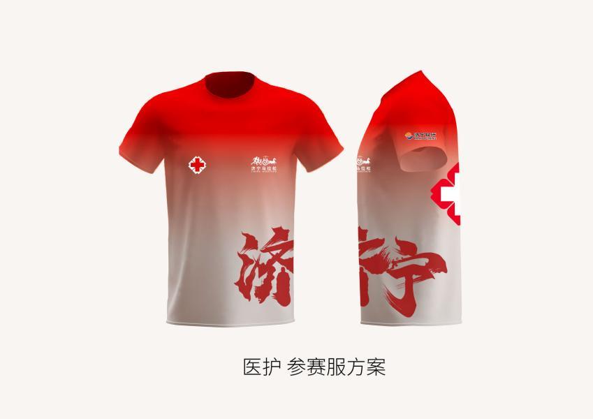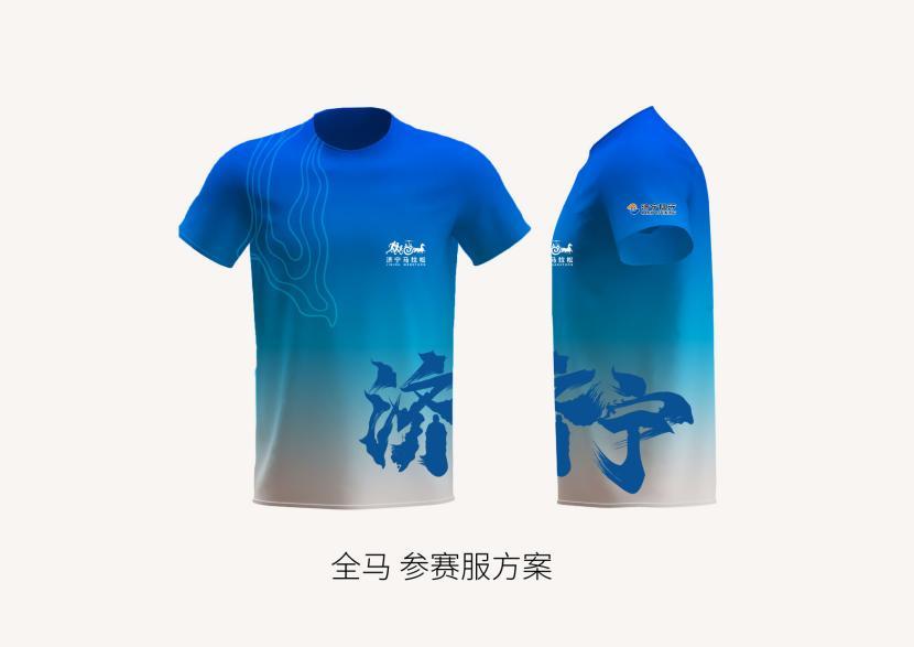 参赛服的设计以“传承历史文化”为核心理念,左上角是一条形似大运河的线条,右下角的“济宁”两个艺术字,将孔子雕像、太白楼和运河的波涛等元素融入字体设计,使参赛者能够直观感受到济宁深厚的文化底蕴。