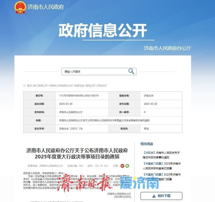为进一步规范重大行政决策程序,推进政府科学、民主、依法决策,根据《重大行政决策程序暂行条例》《山东省重大行政决策程序规定》和《济南市重大行政决策程序若干规定》要求,近日,市政府办公厅公布了《济南市人民政府2025年度重大行政决策事项目录》。