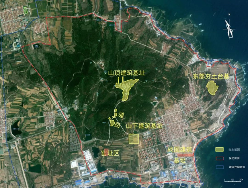 琅琊台遗址位于山东省青岛市黄岛区南部,遗址三面临海,中心为海拔183.4米的山峰。遗址现存大型夯土台基、窑址等多处重要遗迹。2013年,该遗址被公布为全国重点文物保护单位,保护范围总面积约3.8平方千米。