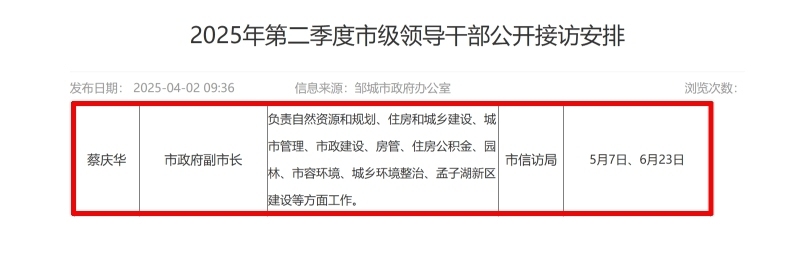 4月2日,邹城市政府官网公布的《2025年第二季度市级领导干部公开接访安排》中,副市长蔡庆华出现在名单。