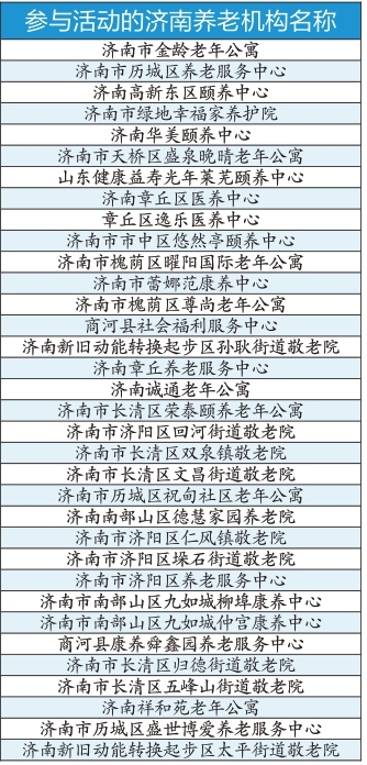 参加此次“百家机构试住周”活动的机构包括:济南市金龄老年公寓等34家机构,青岛市福彩养老院等22家机构,淄博市张店区莲池老年公寓等66家机构,枣庄市山东银光福源健康养老中心等21家机构,东营市养老中心等20家机构,烟台市老年福利服务中心等78家机构,潍坊市奎文区桃源老年公寓等38家机构,济宁市山东梦圆养老护理有限公司等45家机构,泰安市泰山医养中心等18家机构,威海市六合园养老产业发展有限公司等40家机构,日照市中盛幸福院等23家机构,临沂市兰山区兰山街道凯旋养老服务中心等49家机构,德州市蕾娜范颐养院等30家机构,聊城市财金健康产业发展有限公司等34家机构,滨州市滨城区社会养老服务中心等24家机构,菏泽市牡丹区大爱养老服务中心等51家机构,以上共计594家养老机构参加试住周活动。