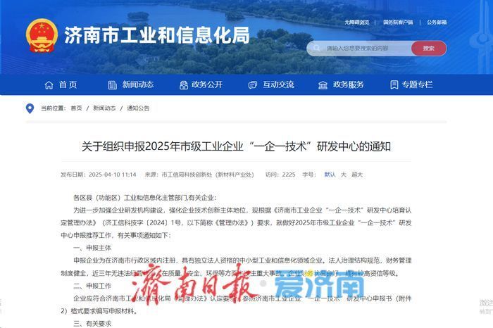 为进一步加强企业研发机构建设,强化企业技术创新主体地位,促进我市中小企业高质量发展,近日,济南市工业和信息化局发布通知,启动2025年市级工业企业“一企一技术”研发中心申报。