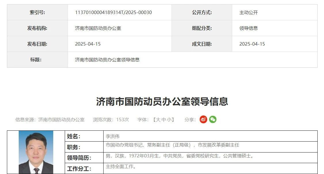 据此前报道,2025年4月1日,济南市国防动员办公室官网领导信息更新,李洪伟已任济南市国防动员办公室党组书记、常务副主任,直至此次兼任市发展改革委副主任。
