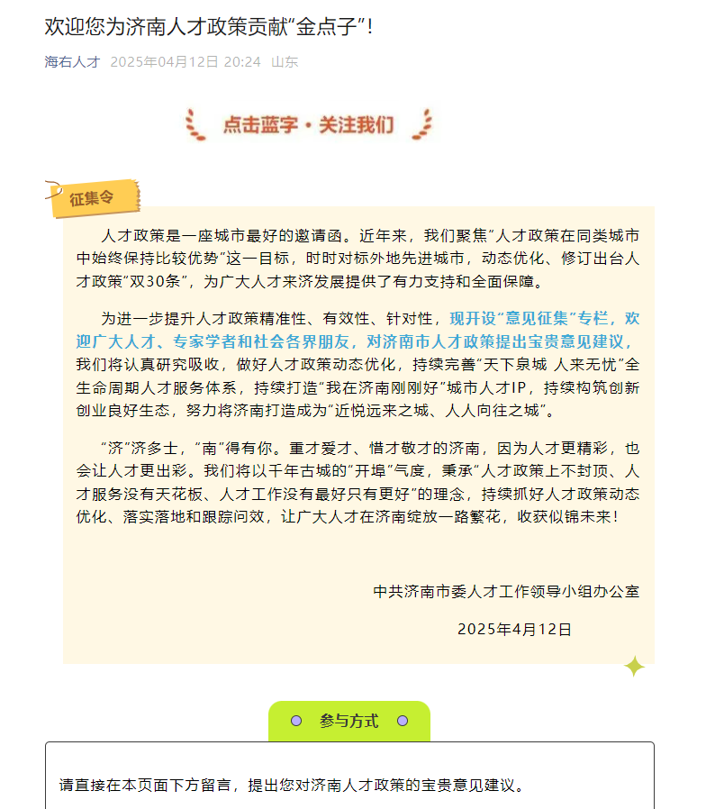 正是抱有这种颇具主动性的狠劲儿,济南才会关注人才政策的精准性、有效性、针对性,才会在专为人才服务的“海右人才”微信公众号上开设“意见征集”专栏,欢迎广大人才、专家学者和社会各界朋友,对济南市人才政策提出宝贵意见建议。