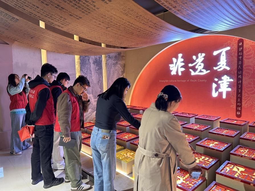 在夏津县非物质文化遗产展厅,实践团成员体验了与椹文化共生的民俗艺术。山东大鼓的铿锵韵律中,《古桑赋》唱词讲述着明代桑蚕业的辉煌;马堤吹腔传承人现场演绎用桑木制作的传统乐器,清越音色穿透千年时光。而在黄河故道森林公园,团队漫步