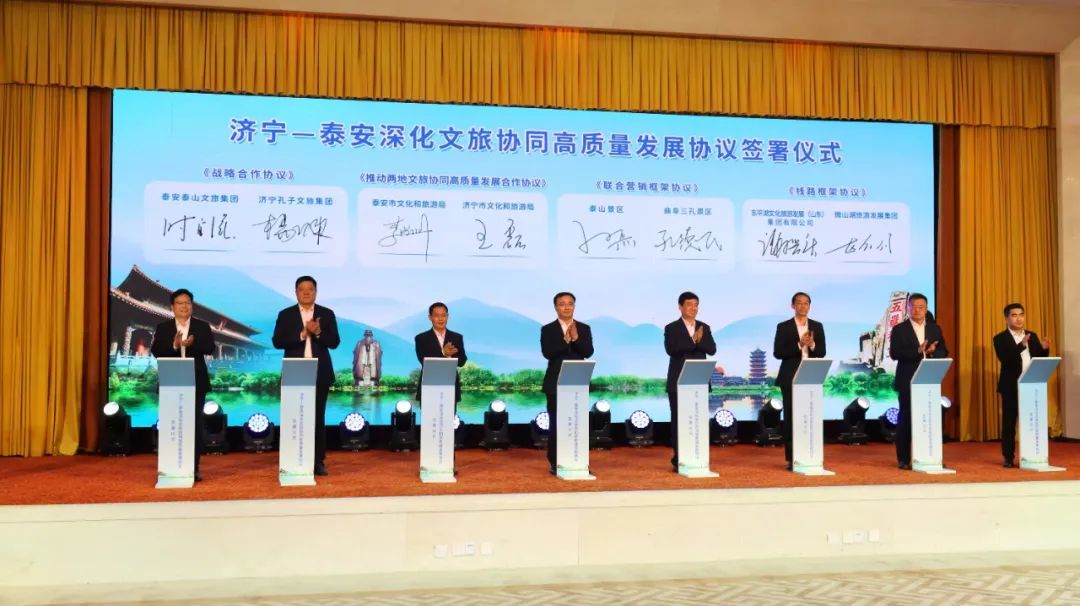 仪式上,两地政府签署了《深化文旅协同高质量发展合作协议》,启动了“圣地济宁 福地泰安”文旅品牌推广季活动,推介了精品旅游线路,并举行了“济宁—泰安旅游直通车”发车及“三孔—泰山旅游联票”发布仪式。两市文化和旅游局,济宁孔子文旅集团和泰安泰山文旅集团等签订了合作协议。