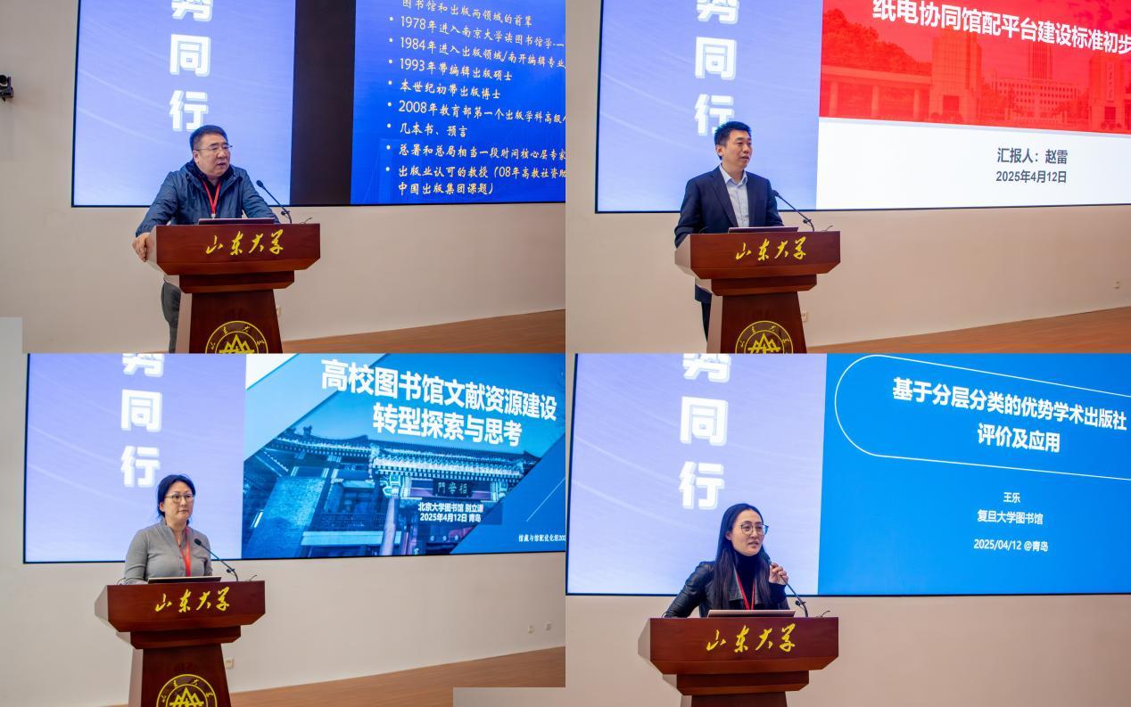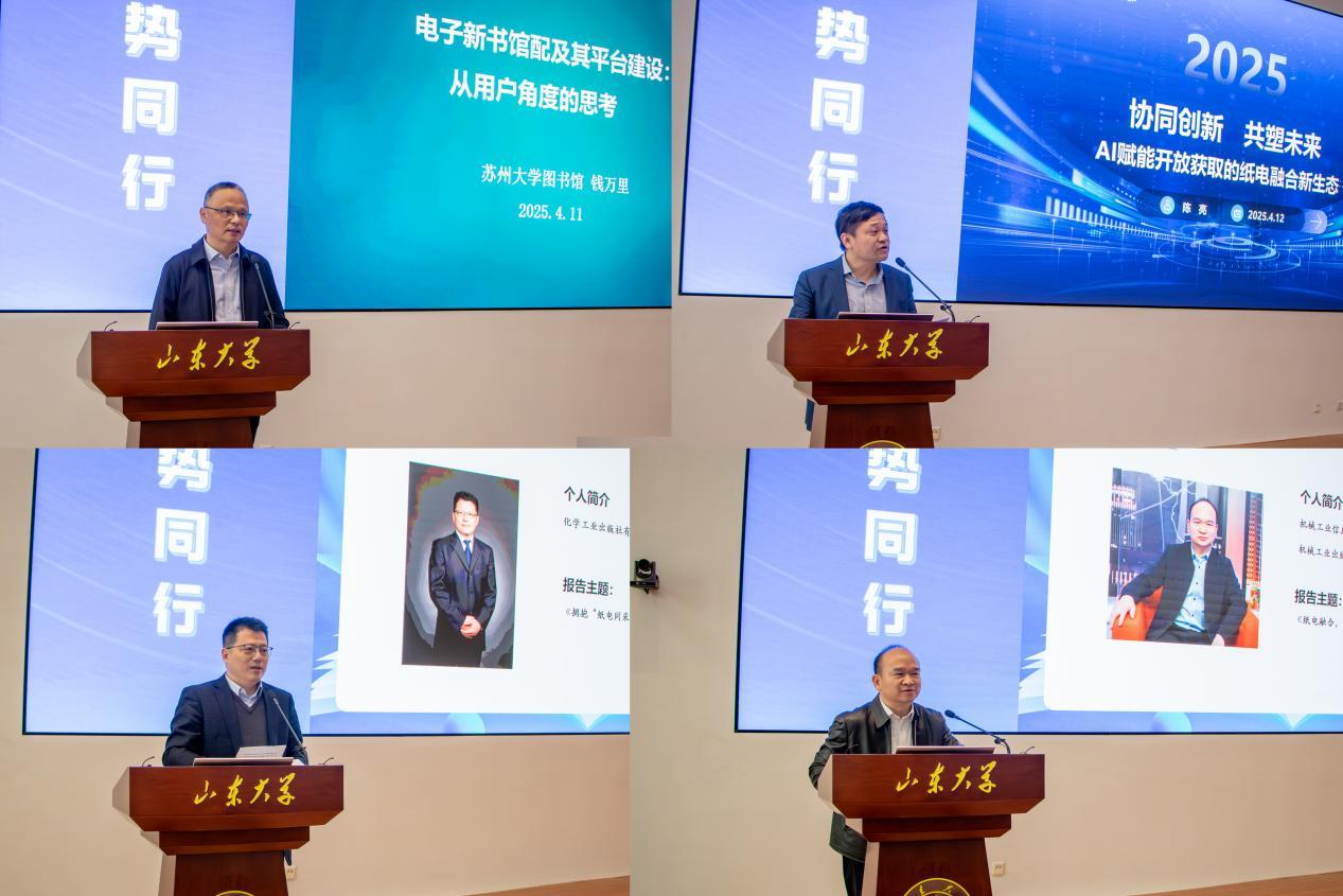 张帅在致辞中表示,纸电协同的馆藏建设是对国家文化数字化战略的积极响应,是图书馆服务转型升级的重要实践,对于优化资源配置、构建健康有序的馆配生态、提升服务质量具有重要意义。山东大学期待与各位同仁携手合作,推进行业规范化、标准化进程共同推动图书馆事业繁荣与进步。许洁表示,纸电资源的同步生产和协同发展已经成为大势所趋,纸电协同馆配平台建设,不仅关乎图书馆资源的优化配置和服务升级,也关系到出版行业的发展创新和市场拓展,希望通过此次研讨会,加强图书馆界与出版界的合作交流,更好地对接国家文化与科技重大战略,主动回应百年未有之大变局对我们提出的历史使命和要求。