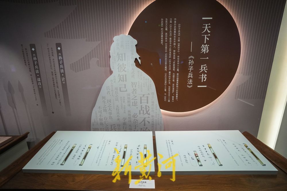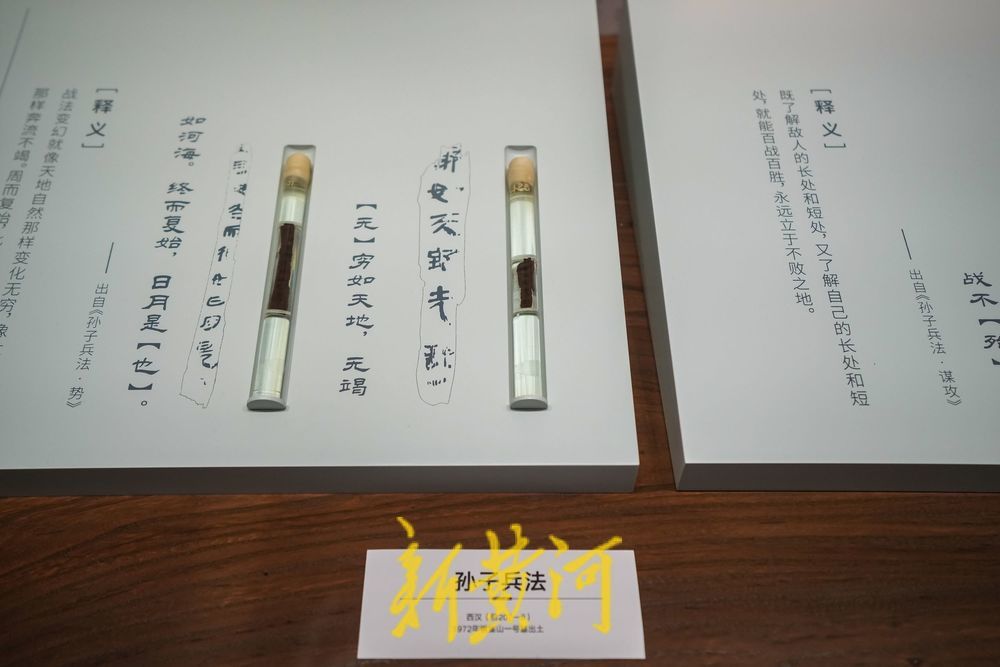 展览的第二部分“雀鸣天下”展出了众多银雀山汉简以及其他相关文物。其中最为重要的当然是《孙子兵法》和《孙膑兵法》。这批竹简不仅破解了孙武与孙膑“兵家双璧”的千古谜题,更让失传千年的《孙膑兵法》重见天日。记者看到,展厅中展出的竹简,都保存在试管液体中,旁边既有竹简上墨迹样貌的呈现,又有释文。如陈列的两件简牍,一件上写的是“故兵知彼知己,百”,另一件上写的是“战不殆”。另一件保存相对完好的竹简,上面写的是:“昔者,梁君将攻邯郸,使将军庞涓带甲八万至茬丘。齐君闻之,使将军忌子带甲八万至……”讲的就是著名的孙膑擒庞涓的故事。