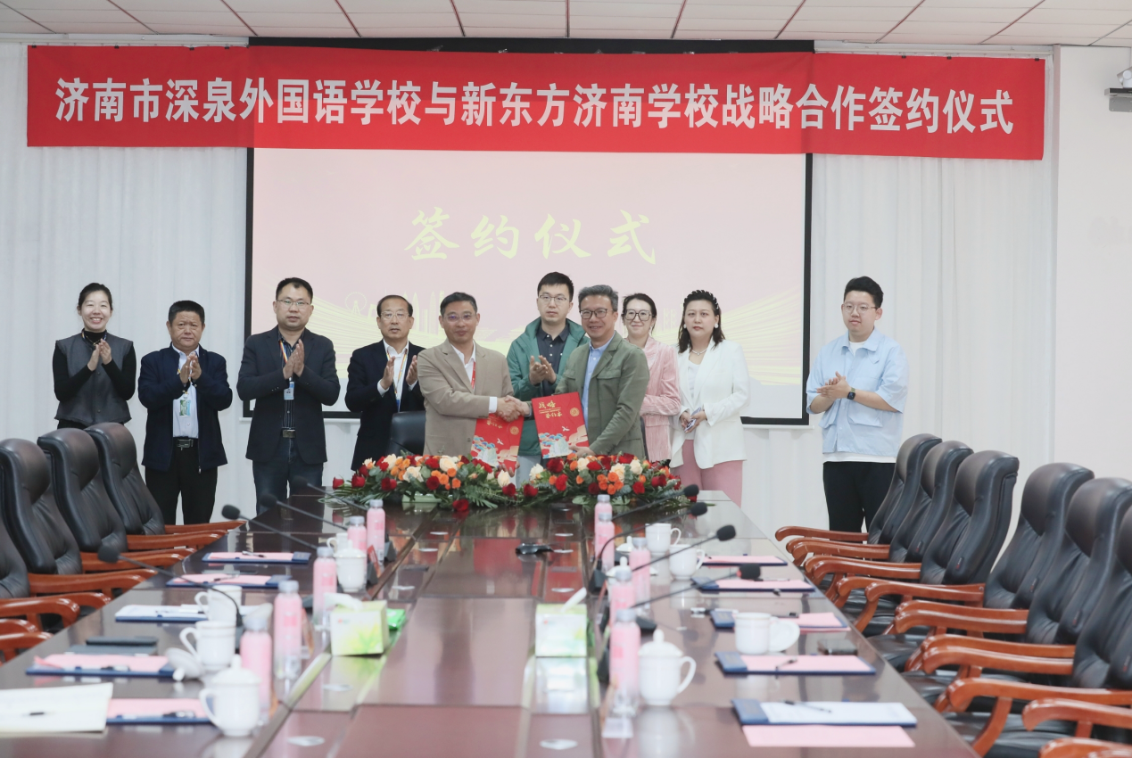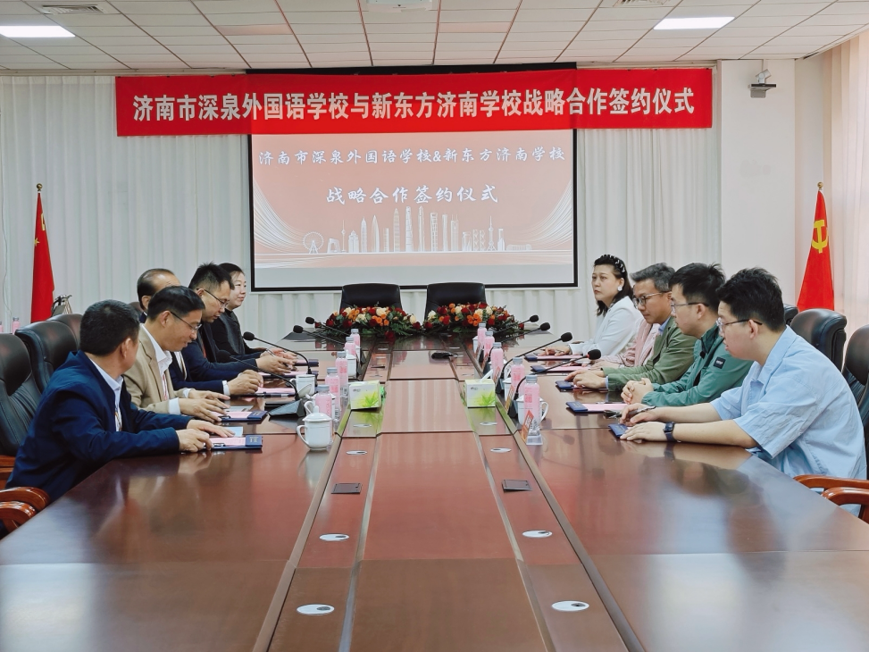 4月24日,“携手共进 智启未来”—济南市深泉外国语学校与新东方济南学校战略合作签约仪式在济南市深泉外国语学校会议室举行。双方达成教学创新领域战略合作,旨在通过智慧教育与传统教学相融合,进一步响应国家“教育数字化”战略。济南市深泉外国语学校王义君校长、济南市深泉外国语学校贝广勇书记及相关领导、新东方教育科技集团助理副总裁兼新东方山东省域总经理陈隆老师、新东方教育科技集团中学智慧学习推广管理中心总经理助理薛雨老师及相关领导受邀出席。