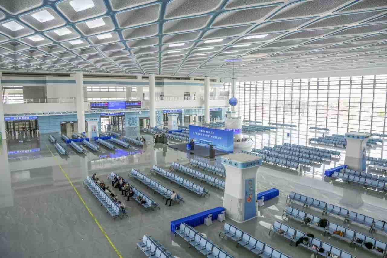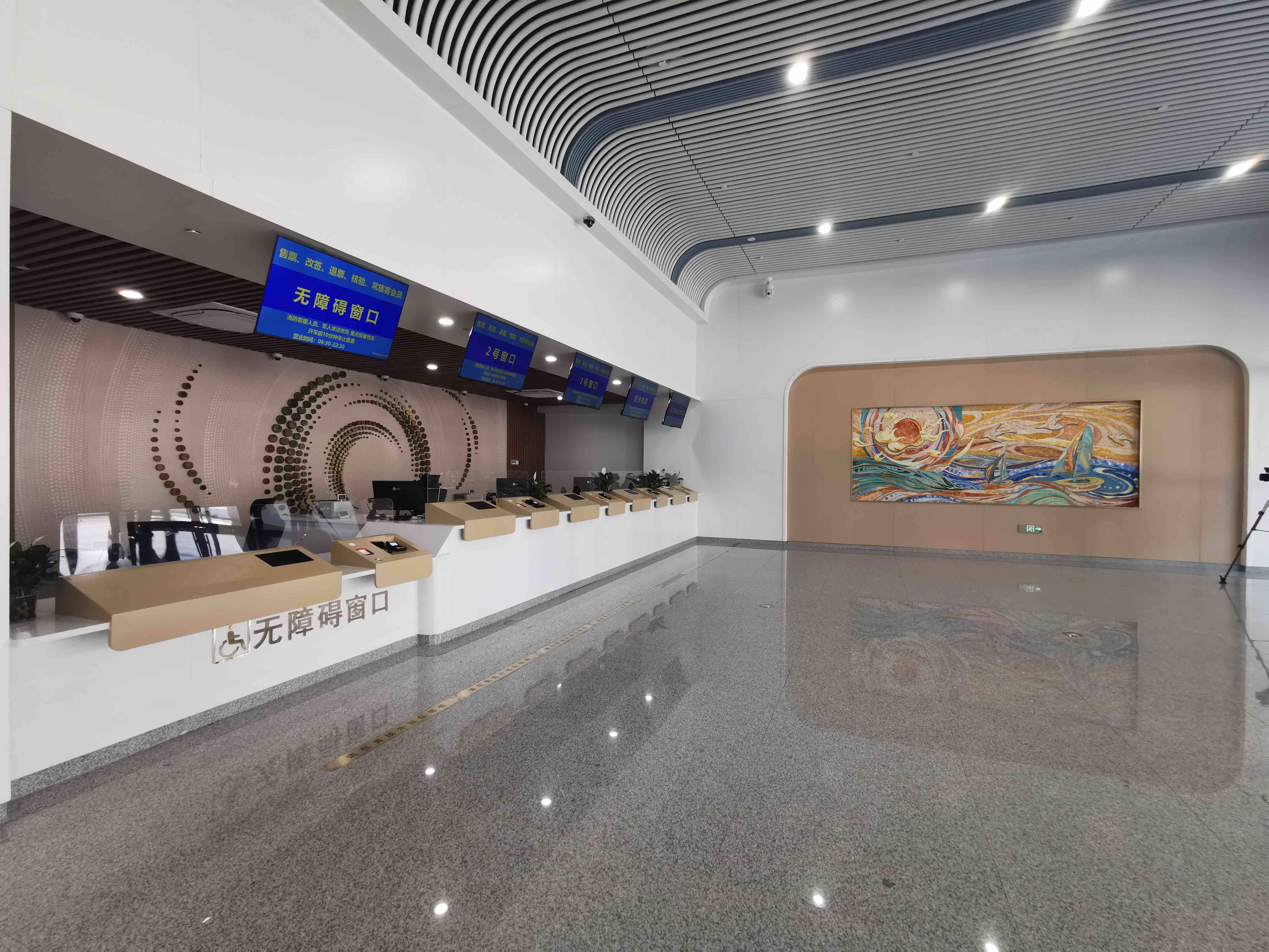站房采用侧式站房与高架式候车厅组成,建筑面积4.35万平方米,分为地上2层,地下1层,局部设置了夹层,合理的空间布局,充分满足旅客多元需求。侧式站房区域主要为售票厅、重点旅客候车室、母婴候车室、军人候车室等;候车厅两侧的夹层,设置了旅服商业区等设施,为旅客提供餐饮、购物等功能。作为旅客进站视觉核心的岛式综合服务台,以“日出曙光”祥瑞景象寓意城市经济蓬勃发展,整体由太阳动态装置与海浪静态装置构成,通过LED球体升降模拟日出日落,配合动态显示屏展示天气及服务信息,呈现实时潮汐变化,同步显示候车资讯,形成兼具信息服务与艺术体验的交互界面。站内还搭配智能导向系统与裸眼3D信息显示器,让旅客能够轻松找到自己的乘车区域。改建后站内共有4个站台,站台设施也全面升级,新增无障碍通道,方便特殊人群出行。