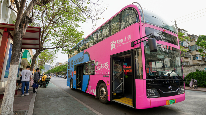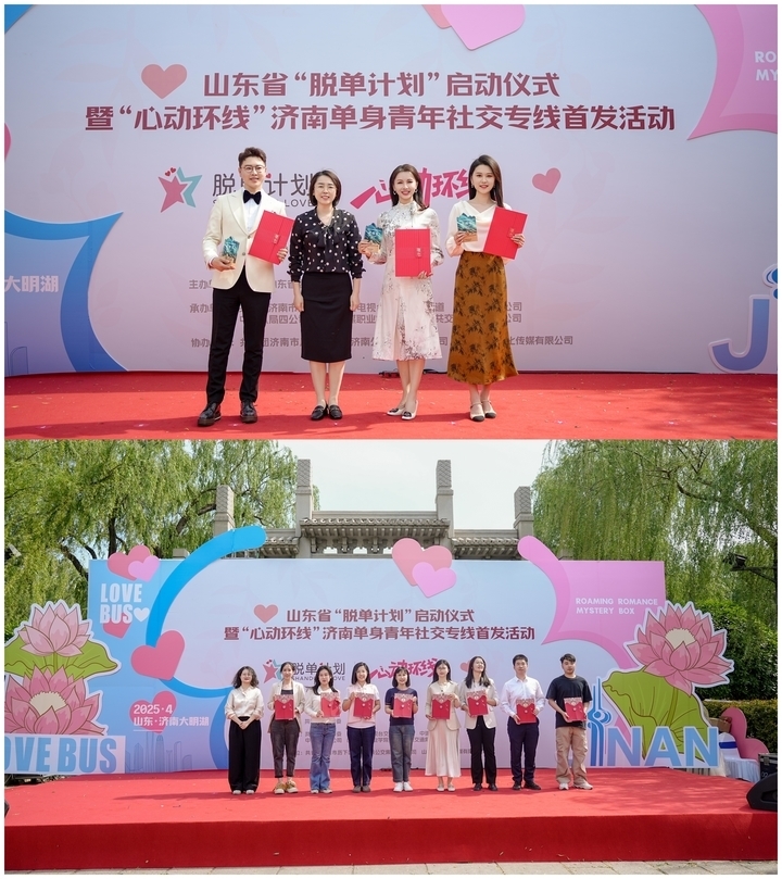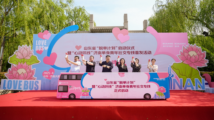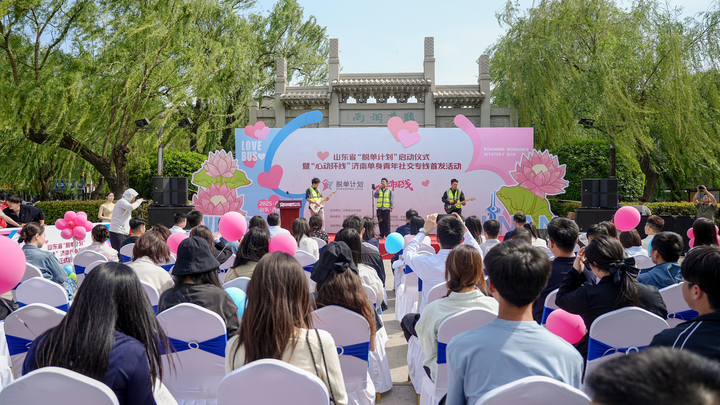 4月26日,由团省委主办的山东省“脱单计划”启动仪式暨“心动环线”济南单身青年社交专线首发活动在大明湖鹊华广场举办。活动以“行走的爱情盲盒”为主题,30余名青年男女踏上首辆“爱情巴士”,共赴春日浪漫之旅。