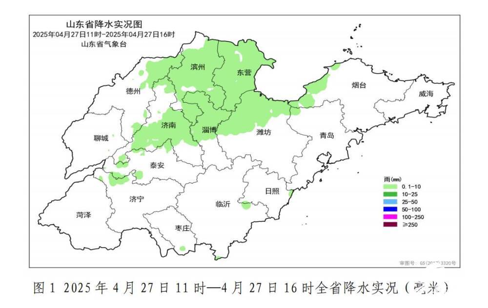 山东省气象台降水数据报告显示,4月27日11时至27日16时,全省共有7市、43县(区、市) 、449乡镇出现降水,平均降水量0.3(毫米,下同),折合水量约0.5亿方。