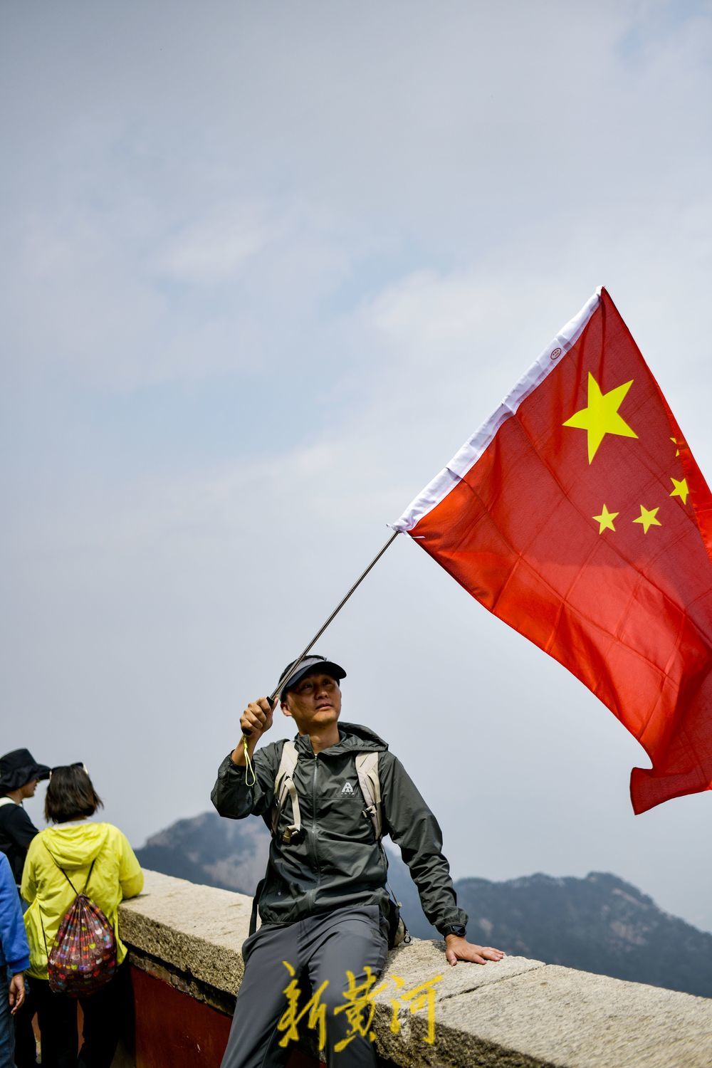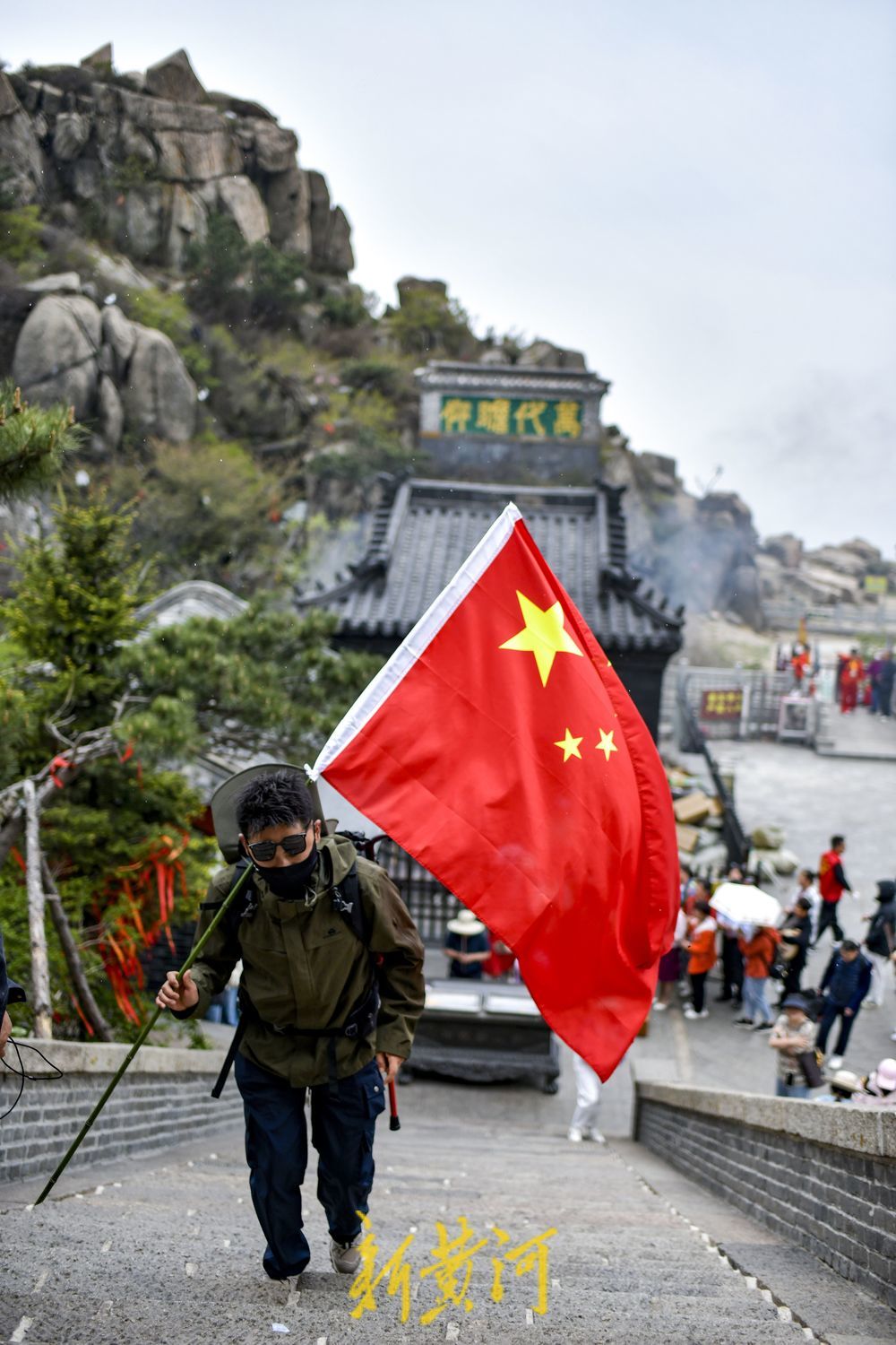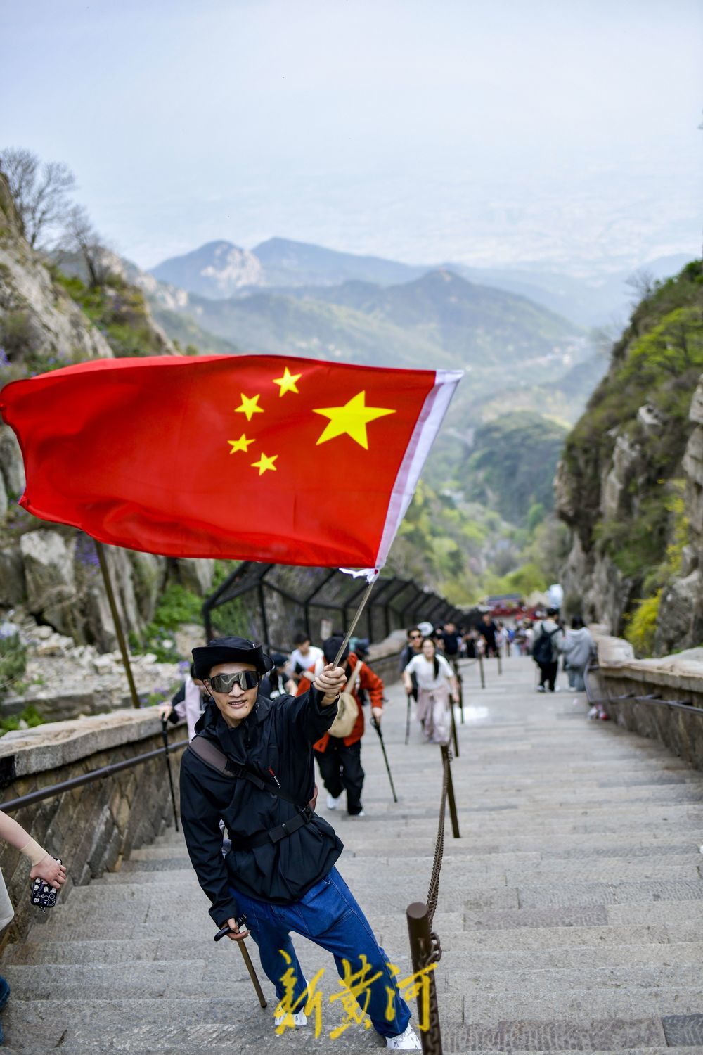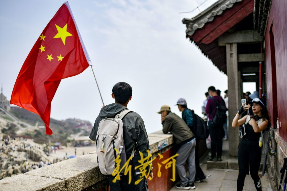 有的游客高举着五星红旗登山,站在泰山之巅挥舞着五星红旗,俯瞰祖国的大好河山,心中涌起无限的自豪与感慨。