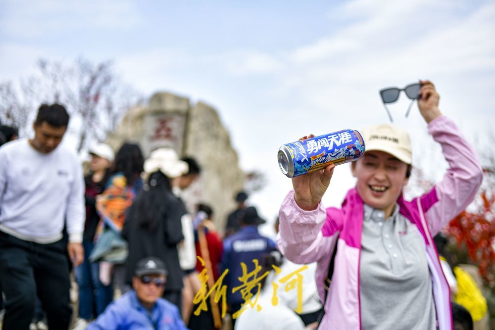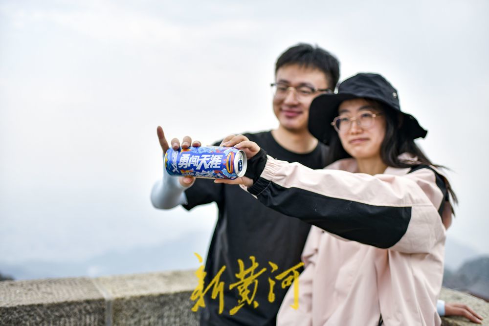 有的游客带着印有“勇闯天涯”和“泰山”的瓶装饮品,在山顶举行饮品包装打卡拍照,记录下登山的激动瞬间。