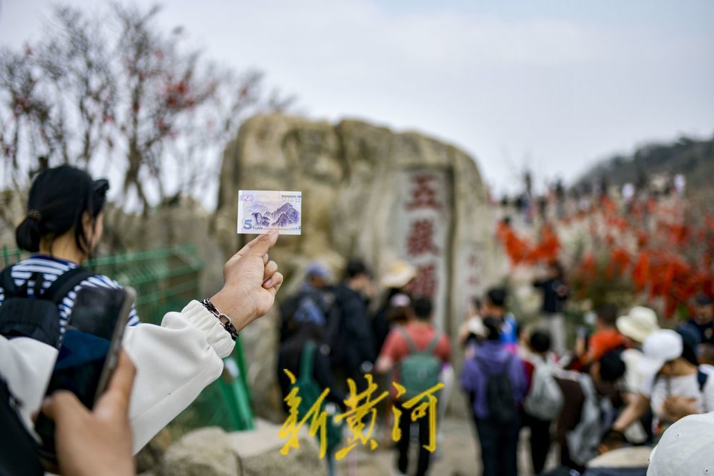 随着“五一”的临近,泰山旅游热度持续攀升, 到泰山打卡的游客开启了多种多样的打卡方式,其中不少游客携5元人民币登上泰山,寻找到第五套人民币5元纸币背面图案的“五岳独尊”石刻,手举5元纸币同石刻合影。