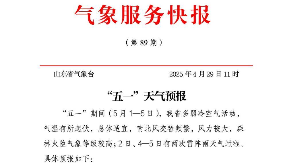 齐鲁网·闪电新闻4月29日讯 山东省气象台今天11时发布“五一”天气预报,“五一”期间(5月1—5日),山东省多弱冷空气活动,气温有所起伏,总体适宜,南北风交替频繁,风力较大,森林火险气象等级较高;2日、4—5日有两次雷阵雨天气过程。